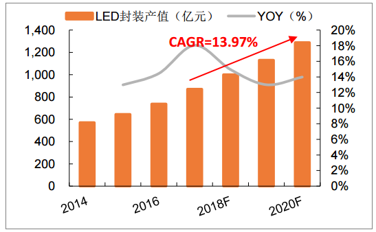 2014-2020年中国LED封装产值及增速