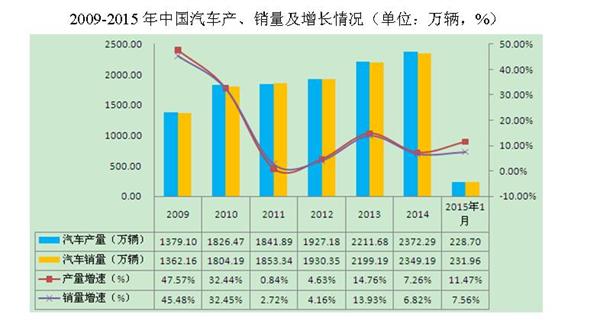 2009年以来,我国汽车产、销量逐年增长,但增速有放缓的态势,一是受下游需求不足影响所致,二是相关限购、节能减排措施等也有所影响。2014年,汽车产、销量分别为2372.29万辆、2349.19万辆,分别较上年增长7.26%、6.82%。