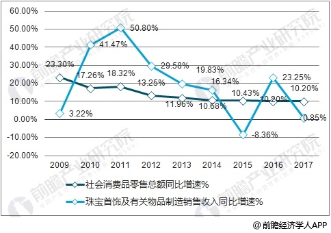 珠宝首饰行业增速与社会消费品零售总额走势对比走势