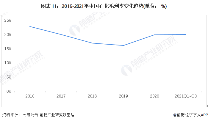 在毛利率方面,2016-2020年,中国石化毛利率呈波动趋势,2016-2019年公司毛利率有所下跌,2019年仅为16.09%。2020年随着石油化工需求逐步回升,毛利率增长至19.83%。